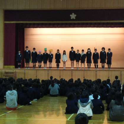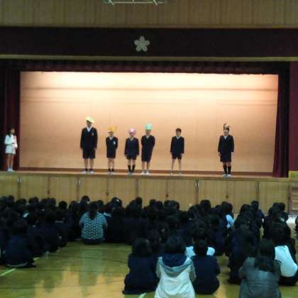 2月26日(火)、児童集会で給食委員会の発表がありました。野菜嫌いの子どもが、好き嫌いをなくしていくお話で、給食委員会の子どもたちが考えた劇を行いました。