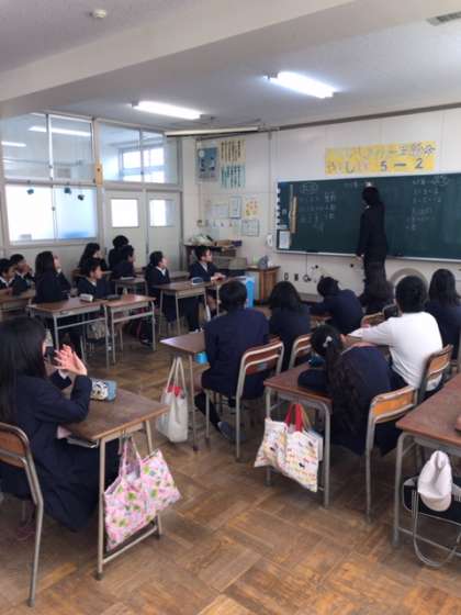 3月1日 佃中学校の数学の先生が、5年生に出前授業を行ってくれました。数のお話や、中学1年の数学で初めに習う「正負の数」について、楽しく教えてもらいました。中学校の先生から中学校の内容を教わると、ちょっと中学生になった気分...が味わえたかもしれません。