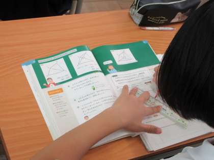 三角形の内角の和が180度であることをもとにして、多角形の内角の和を考える学習をしました。