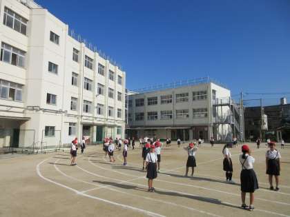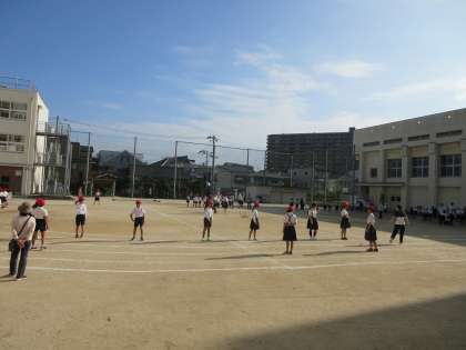 運動場で運動会の全体競技(大玉運び)の練習をしました。