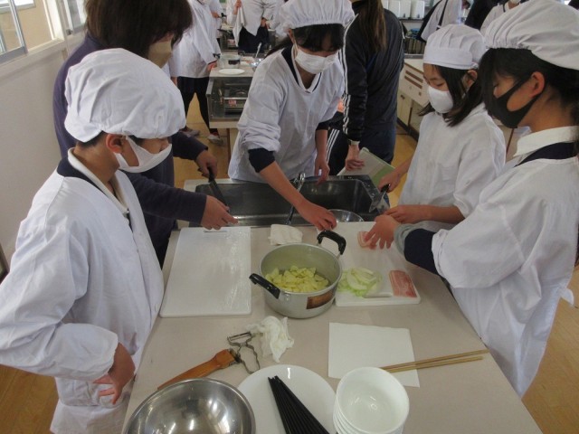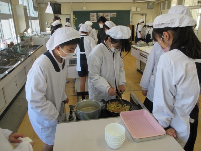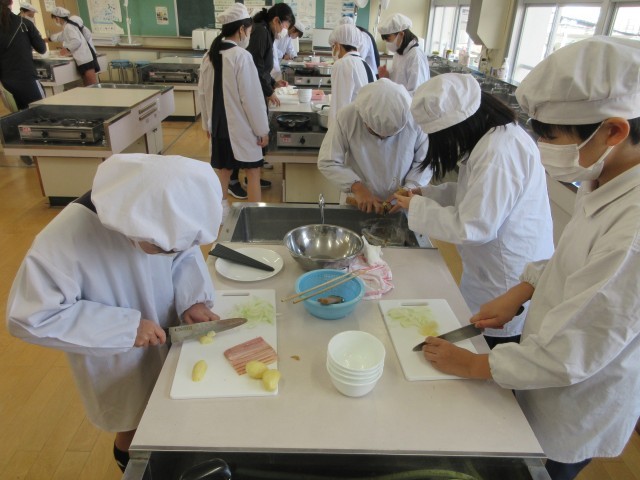家庭科室で調理実習をしました。じゃがいも、玉ねぎ、ベーコンを使って「ジャーマンポテト」を作りました。