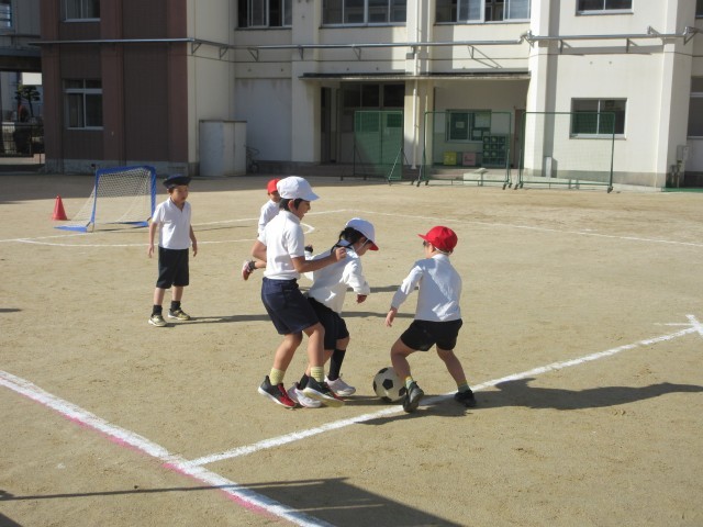 はじめに「しっぽとり鬼ごっこ」をしました。後半はサッカーをしました。みんな元気にがんばっていました。