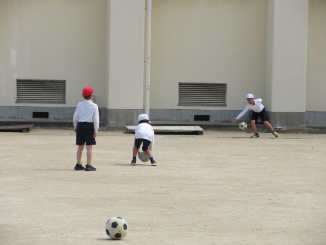 今年度から外遊びの楽しみを増やす目的で、火曜日と木曜日にサッカーボールを蹴ってもいい日に設定しています。