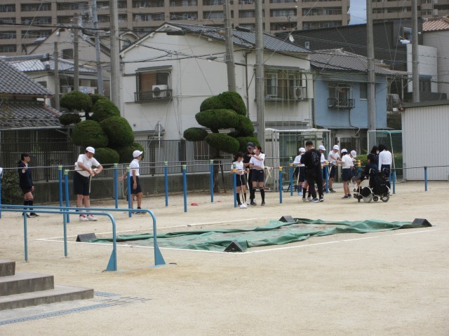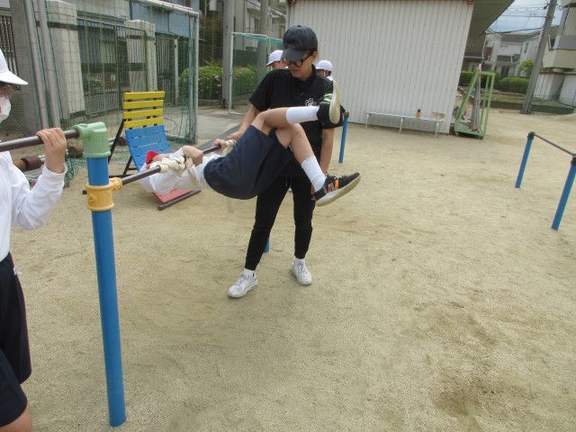 逆上がりのコツをつかむために補助具を使ったり、先生に支えてもらったりしていました。