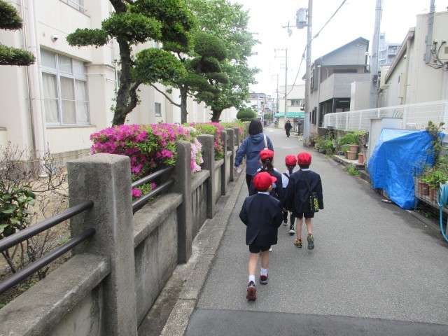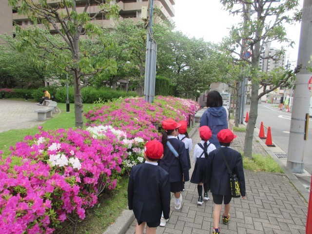 朝のうちに雨がやみ、予定していた1年生の校区めぐりを行いました。桜の時期が終わり、ツツジが美しく咲いていました。