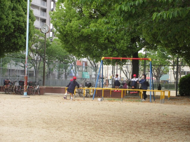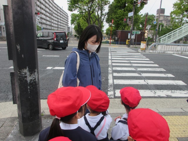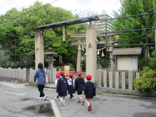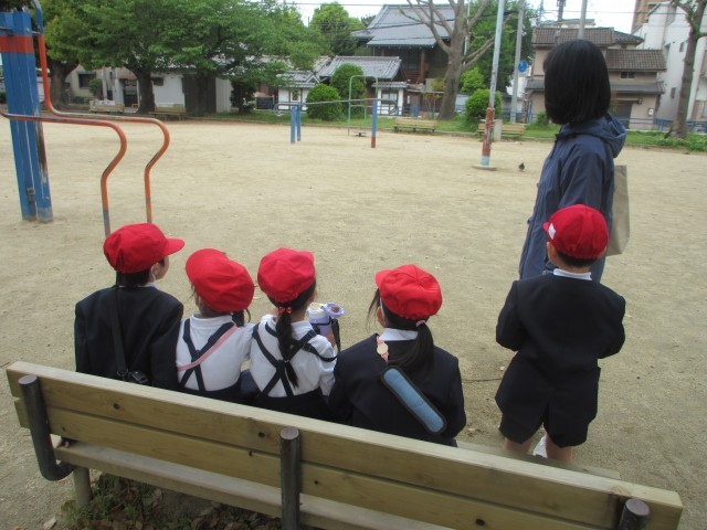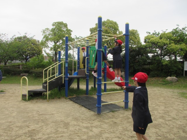 小学校の近くの神社や公園をめぐりました。また、交通量の多い国道の渡り方を確認して、公園の遊具で楽しく遊びました。