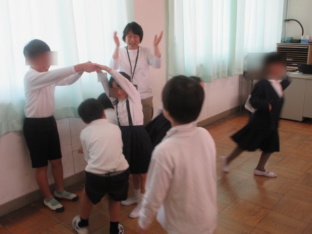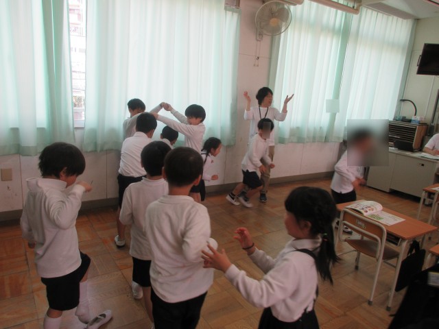 2年生の音楽で「ロンドン橋」を歌いました。2人でロンドン橋を作って、メロディーの終わりの部分で橋が落ちます。子どもたちは楽しそうに歌い、遊びを交えながら大盛り上がりでした。