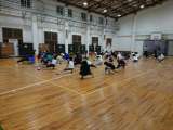 雨が降っていますが、アーチェリーはできました。クラスごとに体育館での遊び(ドッジ...