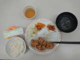 メニューは、人気のからあげ、シュウマイ、スープ、ごはん、みかんゼリーなどです。