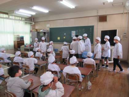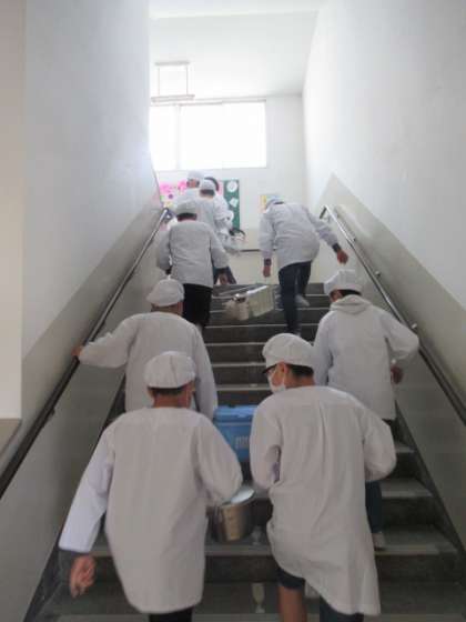 しかし、1年生は給食室までご飯やおかずの入った重たい食缶を取りに行って運ぶのは難しい。そこで、最初のうちは6年生が1年生の食缶を運んで教室まで届けてくれます。