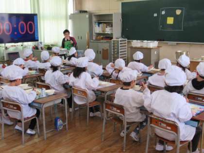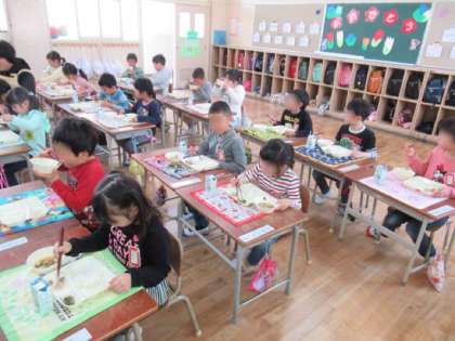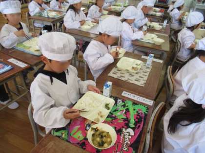 1年生にとっては、香簑小学校で食べる初めての給食です。6年生のお兄さんお姉さんに食缶や牛乳などを教室まで運んでもらい、先生に手伝ってもらいながらがんばって配膳をしました。