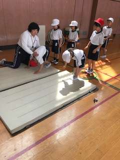 1年生は、現在体育で前転に向けての練習をしています。