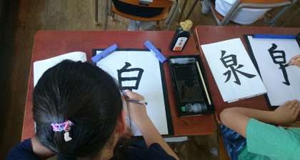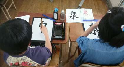 大型テレビの画面を活用しながら、今日の課題「泉」という文字の注意点を確認し、1人ひとり自分で気を付けることを決め、目標をもって書きました。