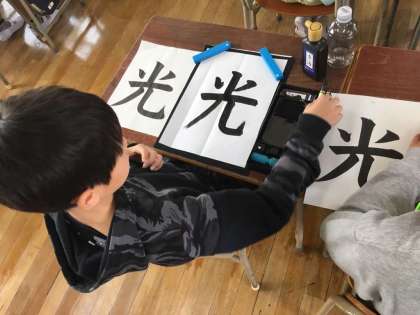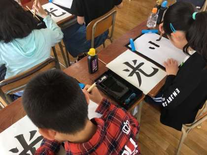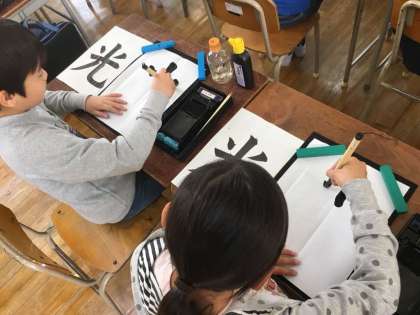 4年生になって、初めての習字です。背筋ぴん、筆を立てて、とても集中して書いていました。教室、階段の掲示板に掲示しています。学習参観の時にご覧ください。