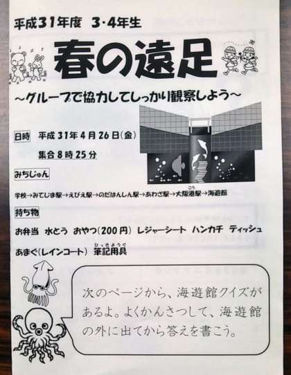 明日26日(金)は、3.4年生の春の遠足です。場所は「海遊館」へ行きます。