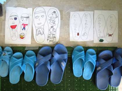 みなさんはトイレの後にスリッパをどうしていますか?スリッパがそろっていないと、スリッパの『神』が怒りますよ。掲示・新聞委員会の作った足型にスリッパをかならずそろえて置きましょう。」