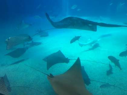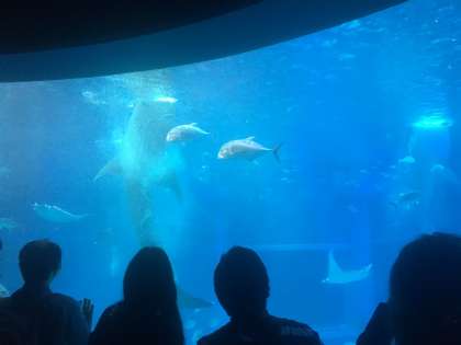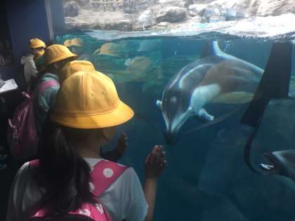 大きな水槽を優雅に泳ぐ魚たち。イルカが目の前に来て大はしゃぎでした。