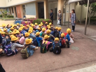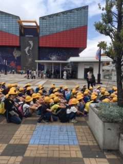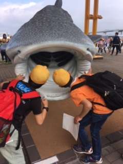 出発直前の様子と、着いた時の様子です。この日は曇りからだんだんと晴れてきたので大阪港から海遊館までは少し暑くお疲れの様子でした。