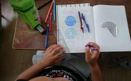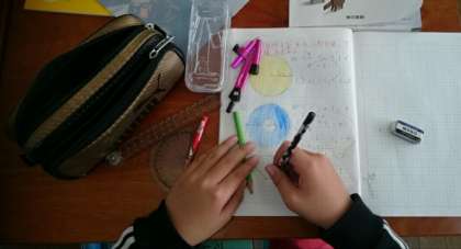 「半径×半径×円周率」という公式を導き出し、練習問題にも取り組んでいます。