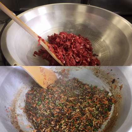 本校では米飯を業者にお願いし、炊いてもらっています。そのため、具は酢っぱめに炊きます。普通のごはんにかけて混ぜて食べる方法です。