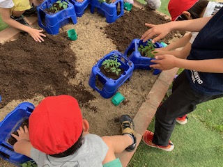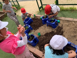土を自分の鉢に入れて、優しく苗を植えました。みんなとっても大切に扱っていました。