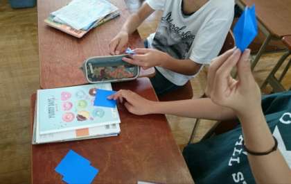 給食を食べ終わった後や、放課後に友だちを待っている間など、ちょっとした時間を見つけ、一羽でも多く折ろうと頑張っている子がたくさんいました。