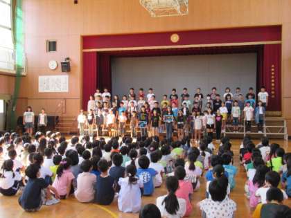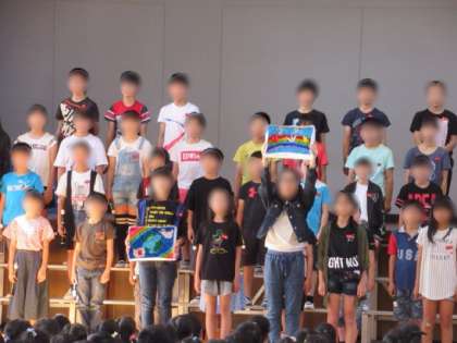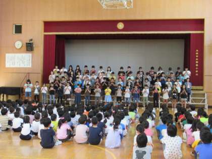 集会では、6年生が慰霊碑に奉納する折り鶴アートと、慰霊祭で演奏するリコーダーによる平和の合奏を全校児童に披露してくれました。