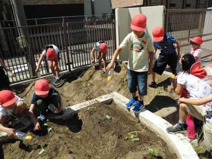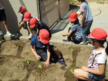 子どもたちは「おおきくなあれ!」「たくさんさつまいもできろ!」思いを込めながら苗を植えました。これからは、自分たちでしっかりと世話をして秋には盛大に「おいもパーティー」をしよう!!!!