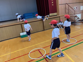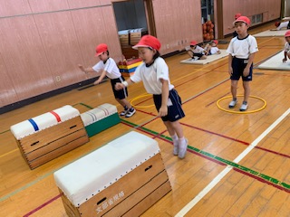平均台やフープ、マットや跳び箱、大型マットを使いました。