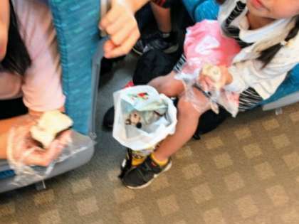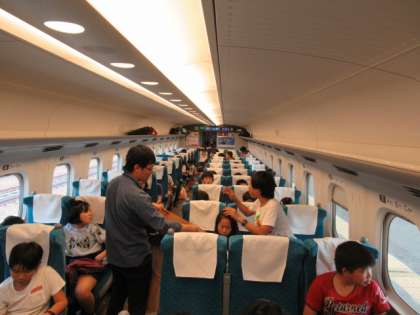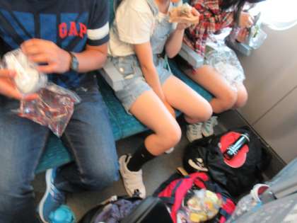 朝が早かったので新幹線の車内で朝食のおにぎりです。みんな楽しそうにおにぎりをほおばっています。