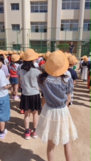 そして宿題を提出ボックスへ出し、黄色い帽子をかぶって外へ出ます。8時25分のチャイムで整列し児童朝会が始まります。
