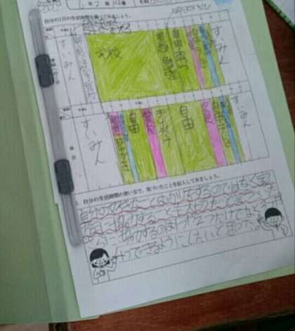 まず、平日・休日の1日の過ごし方をグラフに記入し、それぞれの時間が、自分のためなのか、家庭のためなのか、色分けをして確かめていきました。