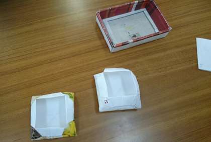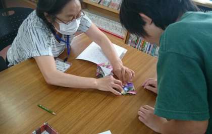 そんな中、図書ボランティアさんが、テーブルを使ったときに出るゴミを入れるための容器を、使わなくなった紙を再利用して作ってくださっていました。