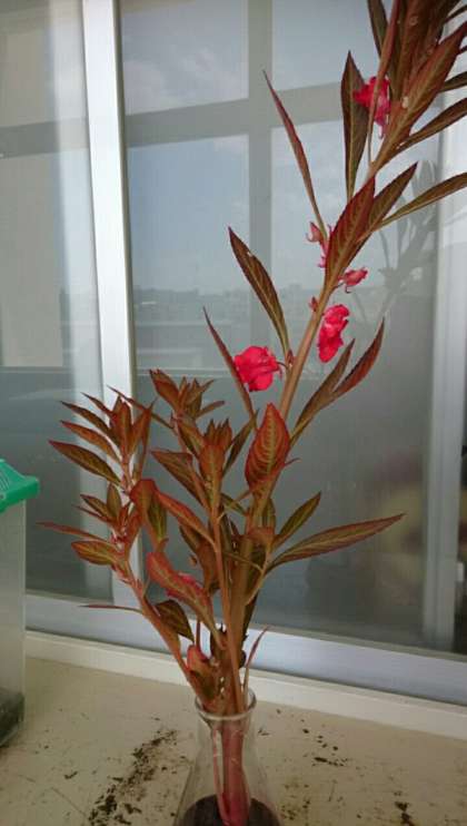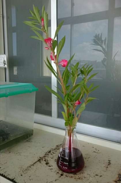 1時間目、学年で世話をしているホウセンカの苗を1つ畑から抜き、教室へ持って行きました。水の通り方が分かりやすいように、赤い色の液にホウセンカをつけ、午後から観察をすることにし、げた箱の上に置いておきました。
