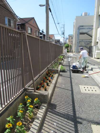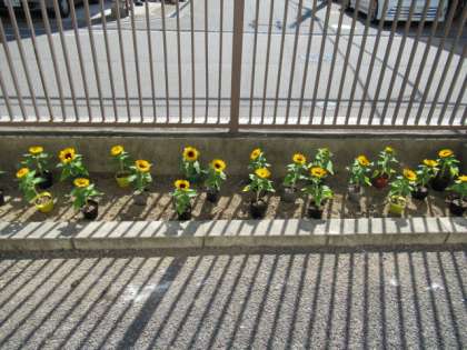 今日は管理作業員さんにお願いして、西門周辺の花壇に約150株を植えました。残りは飼育栽培委員の人たちが玄関周りに植える予定です。