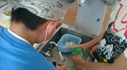 1人ひとりが責任をもって仕事を分担し調理をすすめました。後片付けもていねいに。流し台にゴミが残らないように、最後までチェックできてていいですね!