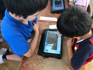 今日は、1時間目に1年生にタブレットの使い方を教えに行きました。