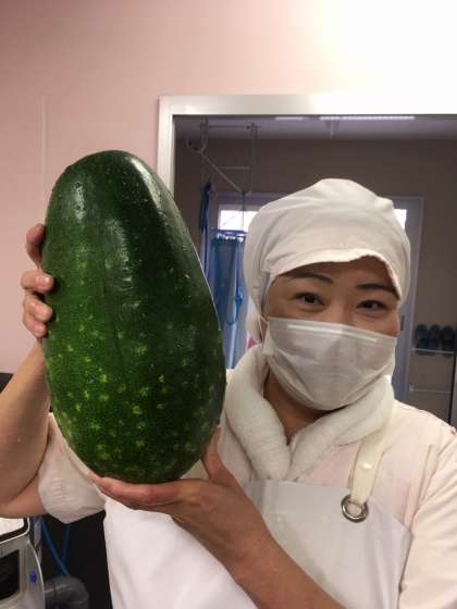 人の顔の大きさの2個分で、およそ1個で約4kgあり、とても身がずっしりしていました。今日の給食で冬瓜の煮物に使用しています。