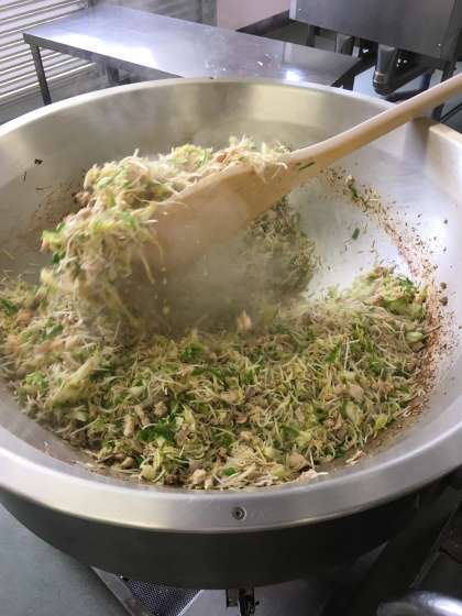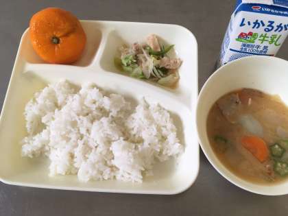 夏野菜のオクラ、ピーマンのほか、もやし、キャベツ、たまねぎ、にんじんが使われています。ピリ辛野菜炒めはすこしピリ辛がきいており、食欲がすすむ献立でした。