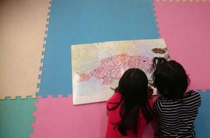 15分休みに図書室をのぞいてみると…ビッグ絵本を楽しんでいる子が!