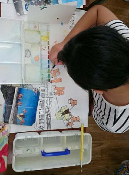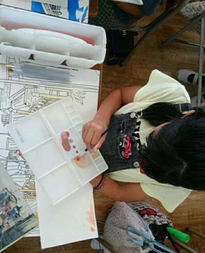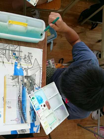 あまり触れる機会のなかった日本画をしっかりと見て、画用紙に同じように描いていっています。