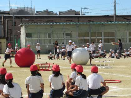 今日の全体練習は、全校児童でおこなう「大玉おくり」と応援合戦の練習をしました。