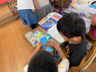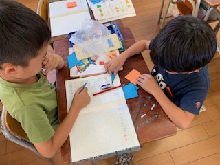 使うのを心待ちにしていた三角定規や折り紙を使って直角を調べ、教室の中の直角を探しました。
