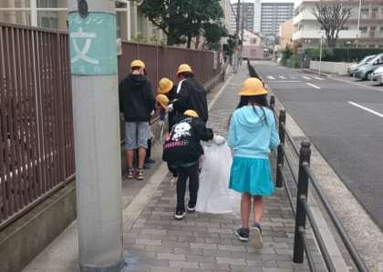 御幣島6丁目公園の周辺だけでなく、学校の周りも落ち葉やお菓子の箱の切れ端など、細かなゴミまで拾い集めました。