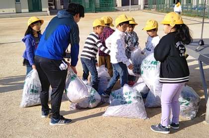 ゴミ袋がたくさん積み上げられ、がんばった成果が披露されました。(集会後、朝礼台前からゴミ置き場まで1年生のみんなが運んでくれました。ありがとう。)