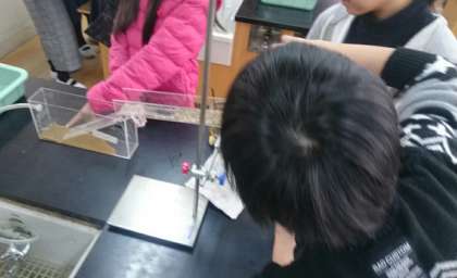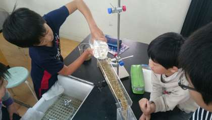 たい積する順番が分かった所で、実際に雨を降らせて確かめる…訳にはいかないので、ペットボトルで少しずつ水を流し、土がどのようにたい積するかを実験しました。