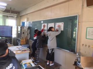 今まで学習した公式を使えるように、問題のひし形の形を変えて、子どもたち同士で学び合っています。