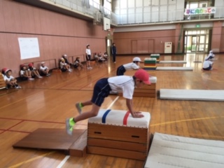 今日は開脚とびです。一組二組混合のグループを作り、そのグループで跳び箱をしました。