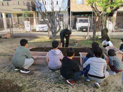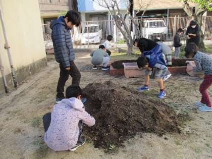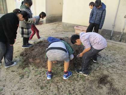 今日のなかよしタイムは、さつまもや夏野菜などを育てた学習園やプランターの片づけと来年度使えるように準備をしました。子ども達は、低・中・高学年の3チームに分かれてプランターに入れる石拾いを頑張りました。来年度は何を育てようかな〜