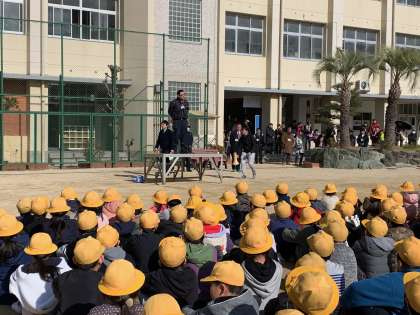 子どもたちは地震発生の放送を聞くと、「おはしも」のきまりを守って全員が無事に非難することができ、真剣に取り組む姿には感心しました。消防署の方のお話の中で、南海トラフ地震が30年以内に起こる確率が80%とあり、子どもたちは地震の恐ろしさをさらに実感したのではないでしょうか。